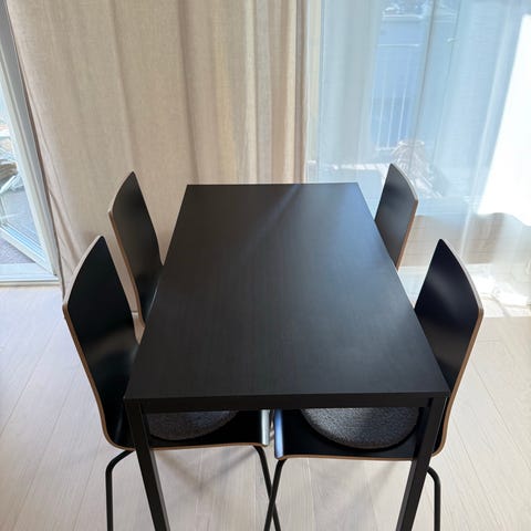 Stolar Gilbert och matbord Tärendö 110*67cm storlek på skivan. Stolarna vita med stålben och liten svart fot. Går att stapla om man vill ha 4 framme och 2 i reserv. Bordet svarta stålben och träbordsskiva, kan behöva läggas ett lager lasyr eller lack på så blir den som ny:)