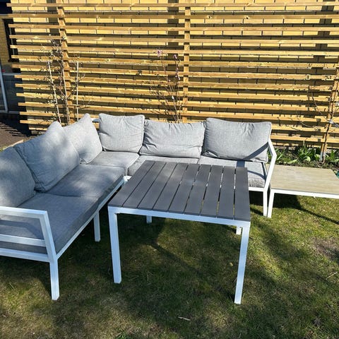 Loungegrupp för utomhusbruk bestående av hörnsoffa med schäslong, fristående fåtölj och rektangulärt bord. Möbelgruppen är tillverkad i mörk konstrotting med grå sitt- och ryggdynor. Bordet har bordsskiva i trälameller. Dynorna är lösa och kan tas av vid förvaring.