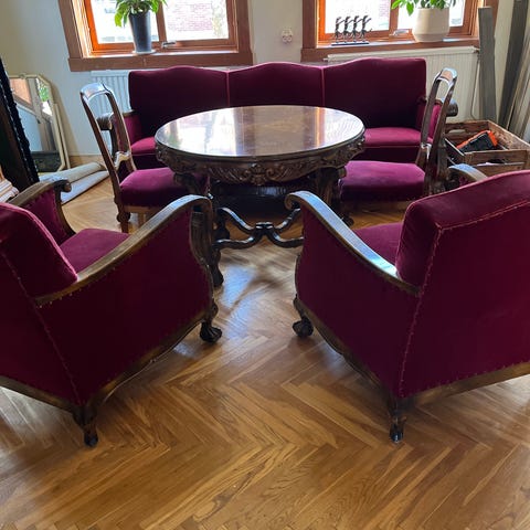 Möblemang med soffa, fyra stolar, bord och skåp