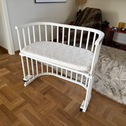 Jättefin bedside crib i mycket gott skick – perfekt för första tiden med bebis!