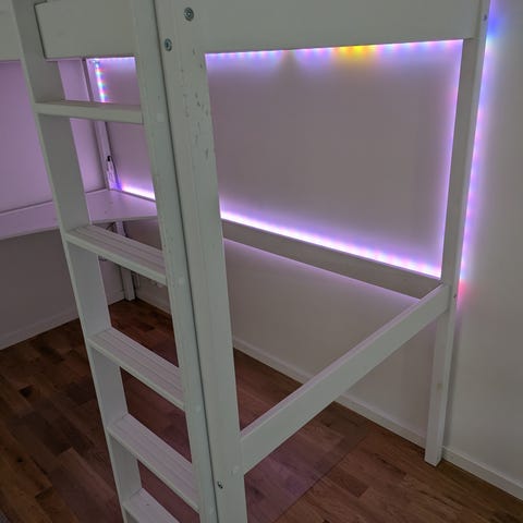 Sängen är i fint skick, men en bräda på övervåningen är lite lös (bara att dra en skruv i).