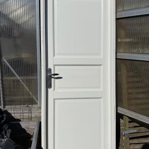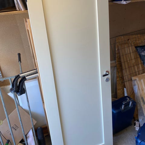Vit innerdörr med handtag och låskista. Slät dörrbladsyta, troligen av trä eller träfibermaterial, målad i vitt. Passar som innerdörr i bostad, förråd eller liknande utrymme. Viss skada syns på ena hörnet enligt bild pga nedmontering. Från originalhus 40-tal.