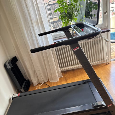 Trekkrunner löpband i hopfällbar modell för inomhusträning. Löpbandet har en digital display med knappar för hastighets- och programval samt hållare för mindre tillbehör. Konstruktionen är anpassad för hemmabruk och kan fällas upp för att ta mindre plats vid förvaring.