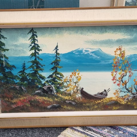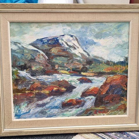 Oljemålning på duk föreställande ett färgstarkt landskap med berg, flod och träd i höstlika toner. Tavlan är signerad, men konstnären vet jag ej vem det är.. Målningen är monterad i en profilerad träram med ljus front och naturfärgad baksida. Passar som väggdekoration i exempelvis vardagsrum, hall eller arbetsrum. Tavlan mått ram, 57,5 x 49,5 tavlan 44,5 x 37cm tavlan ha rektangulärt.
