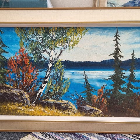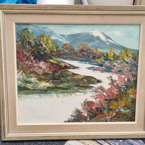 Tavla med landskapsmotiv föreställande sjö, berg och träd i höstfärger. Målningen är utförd på duk och monterad i en ljus träram med texturerad passepartout. Baksidan visar träram och uppspänd duk. Signatur finns i nedre hörnet på framsidan. Passar som väggdekoration i exempelvis vardagsrum, hall eller kontor. Finns I Bro kan tas med till Sollentuna och Åkersberga mm