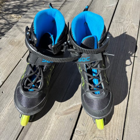SOC ADJ70 inlines för barn, justerbara i storlek cirka 35–38 med angiven barnskostorlek 35-38. Färgkombination svart och gul med mjuk vadderad innersko och hårt yttre skal för stöd runt fot och ankel. Utrustade med fyra hjul i rad och broms bak på ena skridskon. Passar för rullskridskoåkning och inlinesåkning utomhus för barn i angiven storlek.