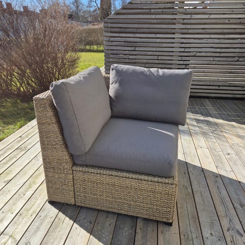 Utemodulsoffa i konstrotting med två sittmoduler. Soffan har lösa rygg- och sittdynor i grått tyg. Passar för uteplats, altan eller balkong. Modulerna kan placeras tillsammans som en liten soffa eller användas var för sig som separata sittplatser.
