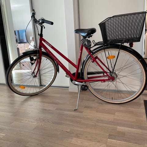 En fin damcykel från Decathlon. Första ägaren, gott skick. Allt fungerar bra. Enda nackdelen är att bakhjulet tappar luft efter ett tag.