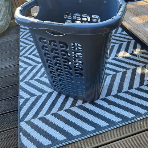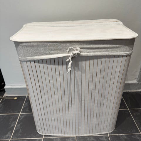 Stilren tvättkorg i flätat palmblad i beige färg. Korgen har handtag och lock. Från Åhléns.