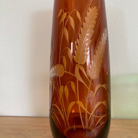 Glas från Carl Rotter Lübeck i mycket bra skick. Glas med mönster i färgen amber (bärnsten). Från 1900-talets andra hälft. Har stått i min mammas prydnadsskåp i alla år. Säljs online för runt 125 Euro, alltså 1250 kr. Två glas till och en vas finns. Samfraktar gärna.
