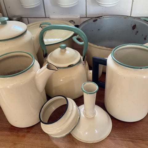 Ska du inreda torpet eller bara gillar gamla nötta grejor, så är detta paketet med emaljerade föremål perfekta.