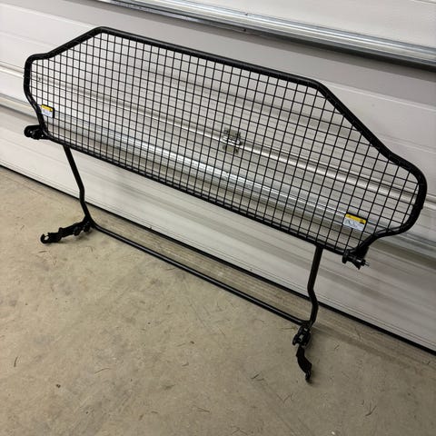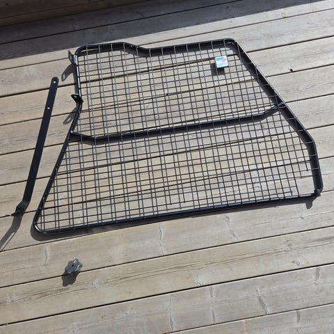 Hundgaller till bil i svart metall. Gallret är avsett att monteras i bagageutrymmet för att avskilja lastutrymmet från kupén och hålla hund eller last på plats under körning. Passar bil med tillräckligt stort bagageutrymme, exakt modell och mått är okända. Gallret har nätkonstruktion med ram i metall och fästen för montering i bilen. Passar Volvo v70 och xc70