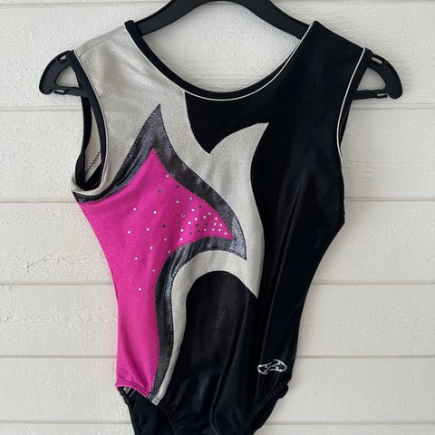 Milano gymnastikdräkt för barn i storlek 152. Ärmlös modell med rund halsringning. Framsida i svart med vit överdel och grön vågdetalj, helsvart baksida. Tillverkad i stretchigt syntetmaterial som ger god rörelsefrihet vid träning. Passar för gymnastik och annan träning för barn i storlek 152. Sömmen över axeln har gått upp på ena sidan.