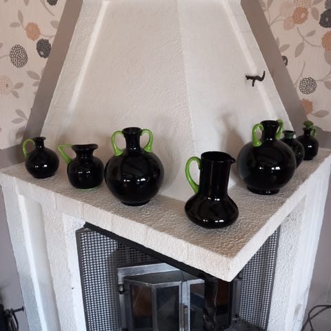 Karaffer och glas i kristallglas.Fån Hovmantorp, Åfors, Johansfors, samt 4 skålar V.Tyskland. Bra skick.