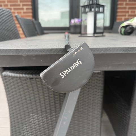 Spalding golfklubbor bestående av en driver och en putter. Drivern har klubbhuvud i metall med svart och röd detaljfärg samt skaft i metall. Puttern har svart klubbhuvud med Spalding-logotyp och skaft i metall. Setet lämpar sig för spel på golfbana eller träningsområde för spelare som behöver driver och putter i samma uppsättning.