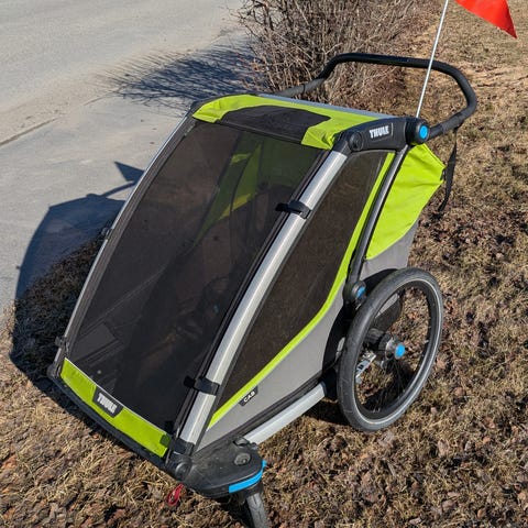 Thule cykelvagn/syskonvagn i svart tyg med grå ram. Vagnen har plats för två barn med individuella 5-punktsbälten. Utrustad med stort myggnät och väderskydd framtill samt förvaringsficka/bagageutrymme baktill. Stora luftfyllda bakhjul ger stabil gång och dragstång fram gör att vagnen kan kopplas till cykel. Justerbart handtag baktill för användning som promenadvagn. Passar för transport av barn vid cykling och promenader.