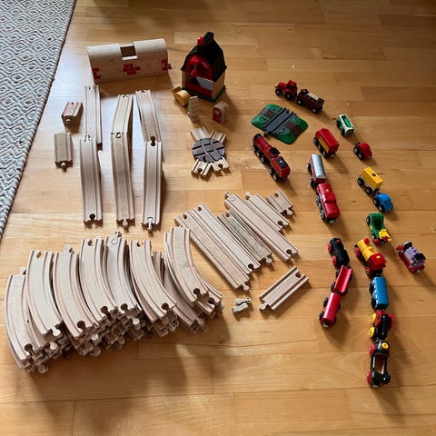 IKEA trätåg med räls och tillbehör. Setet består av flera raka och kurvade träskens, växlar och brodelar samt olika tillbehör som tåg, vagnar, fordon, tunnlar, träd, vägskyltar och bommar. Delarna är tillverkade i trä och plast och kan kombineras på olika sätt för att bygga varierande tågbaneuppsättningar för barn.
