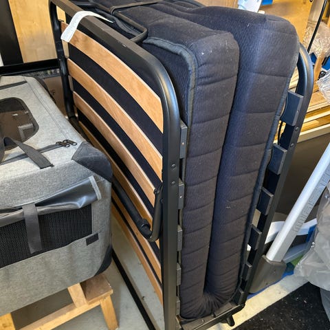 Sängen är hopfällbar och har en enkel madrass ovanpå en metallram med fjädrande botten.