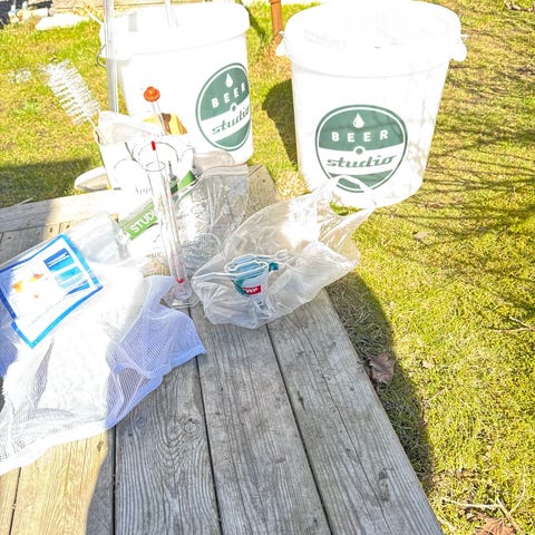 Äppelpresso fruktpress i trä med röda metallband och röd pressmekanism. Pressen står på ett vitt uppsamlingskärl med pip för avtappning av saft eller must. Lämplig för pressning av frukt, exempelvis äpplen och bär, vid tillverkning av must eller saft i hemmet. Konstruktionen består av trästavar, två trälock och en manuell skruvpress i metall som spänner ned pressplattan mot frukten.