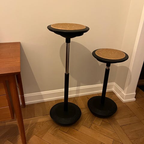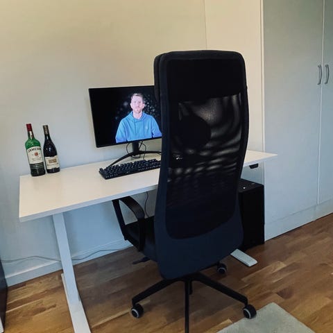 Ergonomisk kontorsstol, IKEA 90-tal. Maxhöjd ca 70 cm minhöjd ca 50 cm. Klädd med skinn, sliten fin patina. Funkar bra när man sitter men sitsen lossnar när man lyfter den, så man får trycka tillbaka den igen.
