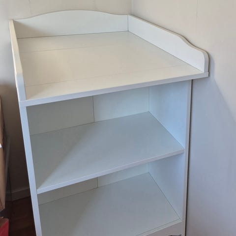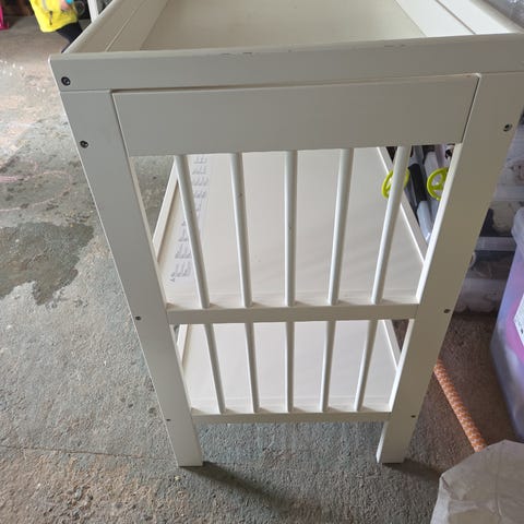IKEA skötbord med två öppna hyllplan i vit färg. Överdel med upphöjda kanter runt skötytan för att hålla skötunderlägg och tillbehör på plats. Underdelen har öppna hyllor som ger förvaring för blöjor, kläder och andra babyartiklar. Passar i barnrum eller badrum där man behöver en fast plats för blöjbyten och omvårdnad av spädbarn.