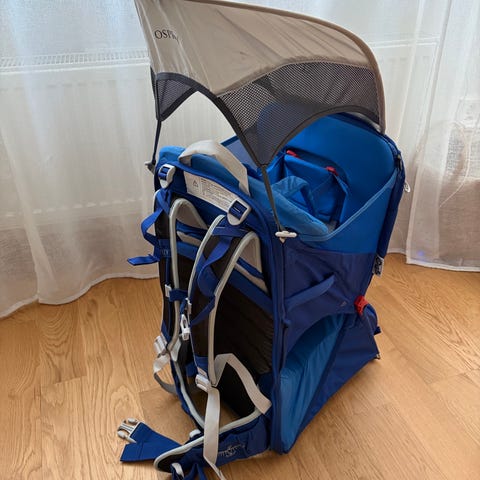 Bärstol för barn upp till 22 kg med sol och regnskydd. Har ett mycket bra bärsystem som gör den bekväm att bära.