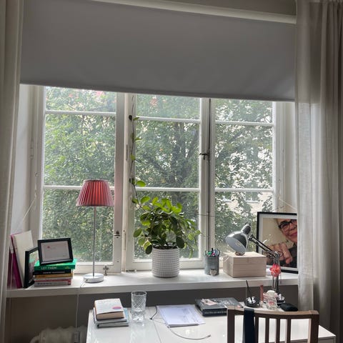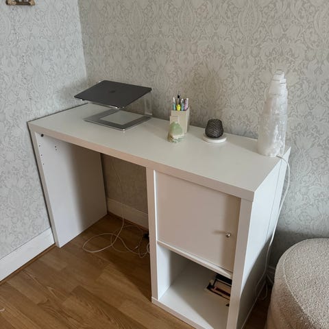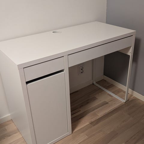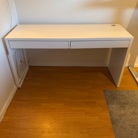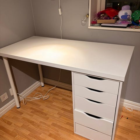 Skrivbordet har några små skador på bänkskivan (se bilder) samt att vi borrat ett eget hål på baksidan för eluttag ( inget som syns om man har bordet mot väggen).