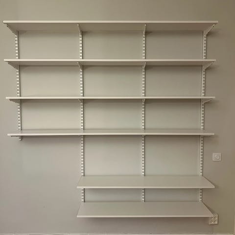 Rejält system av stringhyllor, vita till färgen och inga skador.