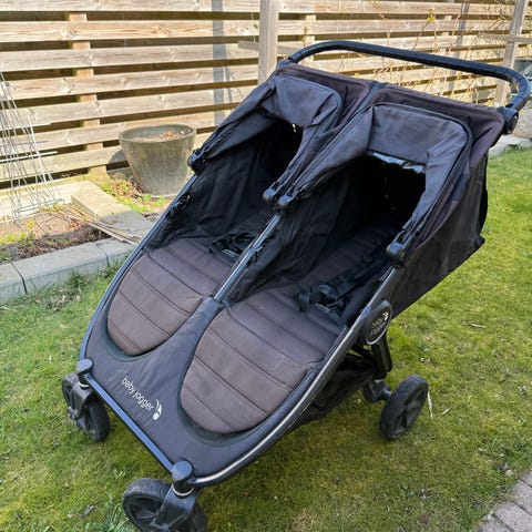 Carena syskonvagn/dubbelvagn i svart. Vagnen har två separata sittdelar med individuella ryggstöd och selar. barnvagnen har en avtagbar liggdel.