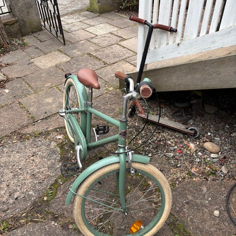 Stålhästen barncykel med 20" hjul. Cykeln har grön ram, bruna handtag och sadel samt ljusa däck. Utrustad med fram- och bakskärm, stöd och korg framtill. Cykeln har förvarats inomhus och är i fint skick, bortsett från en synlig reva i materialet på ett av handtagen.