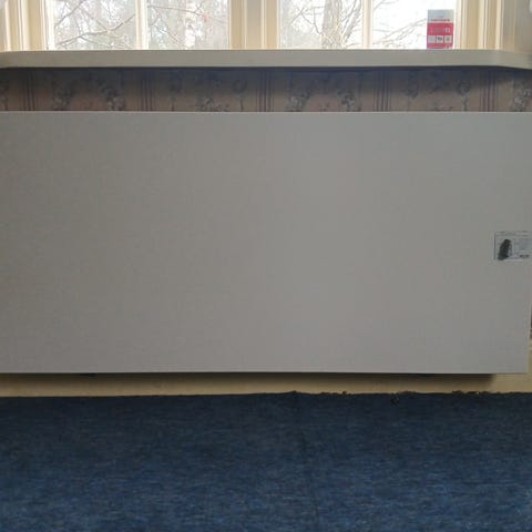 Element panelradiator i vit färg med termostat. Radiatorn är av paneltyp med vertikala kanaler och anslutning för vattenburet system. På bilden syns även väggfästen/skensystem för montering. Lämplig för uppvärmning av inomhusutrymmen där vattenburen värme används.