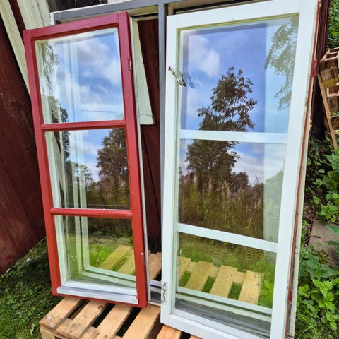 Gamla, rejäla tvåglasfönster i trä, med haspar. Bredd varierar lite mellan 475 och 490 mm. Två storlekar.