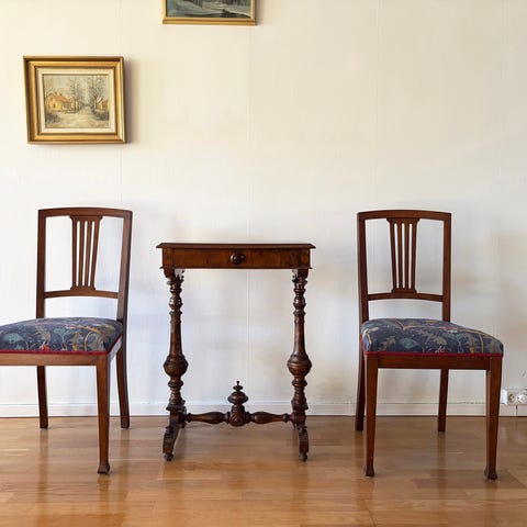 Två stolar i mörkbetsat trä med klädsel i guldgult mönstrat tyg, rent och välbevarat. Hantverksmässigt utförda stolar med prydlig underspänning. Träet har fin lyster, stolarna är i gott skick med naturlig patina. En stol har lätt instabilitet i ryggen men det påverkar inte funktion eller helhetsintryck.