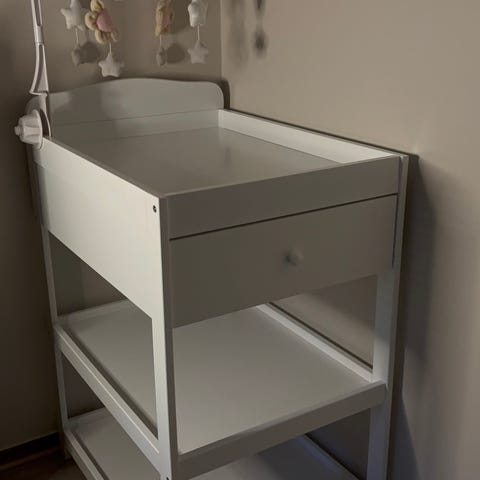 IKEA skötbord med förhöjda kanter runt skötytan. Möbeln är vit och har fyra utdragbara lådor på ena sidan samt två öppna hyllfack på den andra sidan för förvaring av blöjor, kläder och tillbehör. Skötbordet är avsett för barn och ger en arbetsyta i bekväm höjd för blöjbyten och omvårdnad. Passar i barnrum eller badrum där extra förvaring behövs.