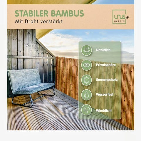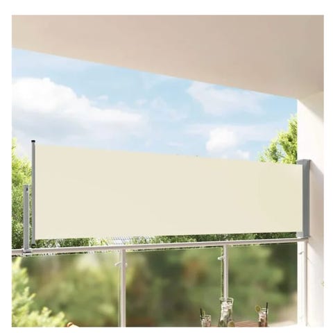 Balkongskydd med metallram i beige textil- eller plastmaterial. Monteras på balkongräcke med hjälp av medföljande metallfästen och skruvar, som syns på bilden. Skyddet fungerar som insyns- och vindskydd på balkong eller uteplats. Passar räcken med rund eller fyrkantig profil där klämfästena kan spännas fast runt räcket. Lämpligt för användning utomhus under säsong enligt behov.