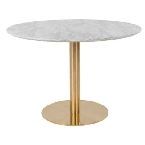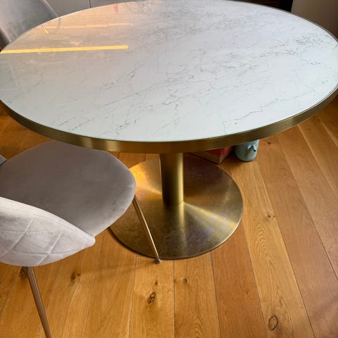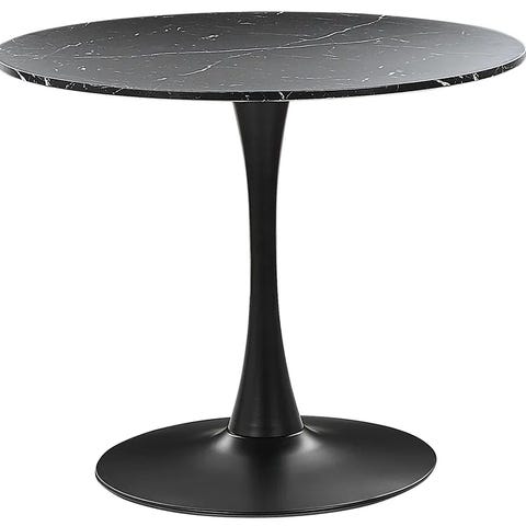 Säljer ett stilrent runt bord från Mio med marmormönstrad skiva i härdat glas och svart metallfot. Tidlös design som passar perfekt som matbord eller köksbord.