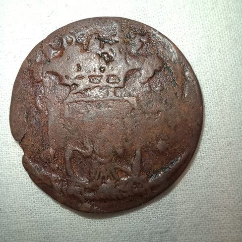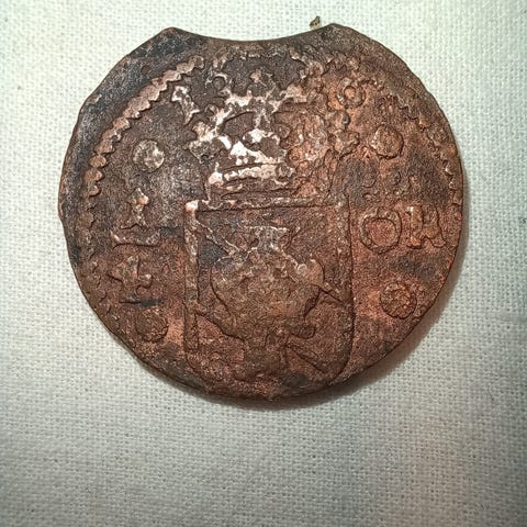 1635, 1/4 Öre Ena sidan visar en krona ovanför en sköld med ett stiliserat motiv, den andra sidan visar tre kronor samt bokstäver runtom. Myntet är präglat i kopparfärgad metall och har tydliga spår av ålder och slitage. Exakt årtal, valör och ursprung är inte fastställt utifrån bilderna.