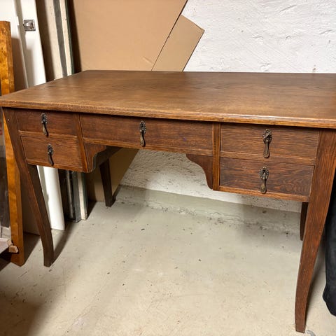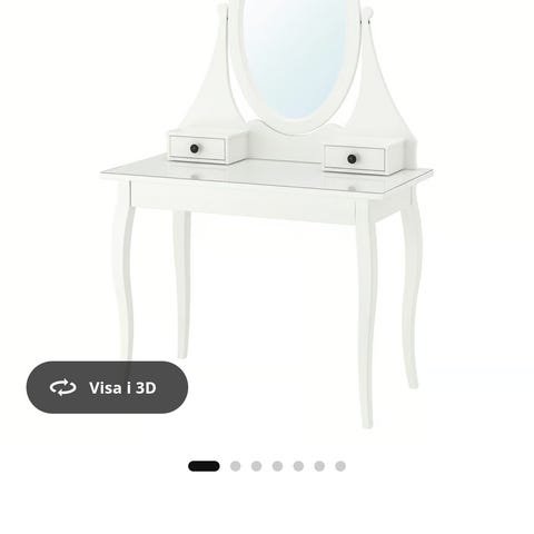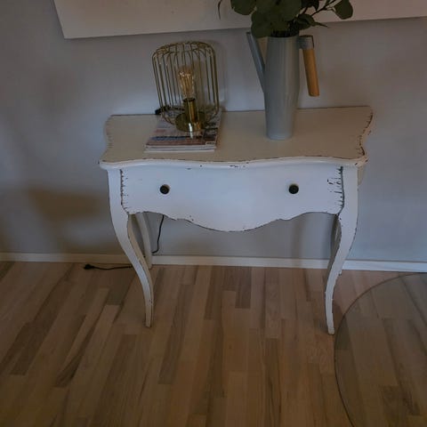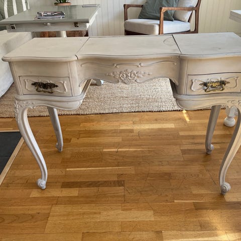 Denna möbel är ett vitt skrivbord eller sminkbord designat i rokokostil med inslag av shabby chic.