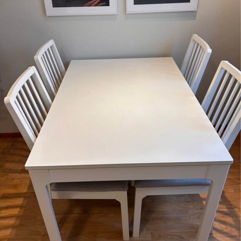 Klassisk vacker matsalsgrupp. Bord 180cm (kan bli 225 cm) Stolarna och bordet har använts; så lite skavanker på färgen men inget funktionsfel . Inkl 6 st klassiska stolar .Plats för max 12 pers med inläggsskivan, tungt, stadigt och rejält.Säljes i befintligt skick.