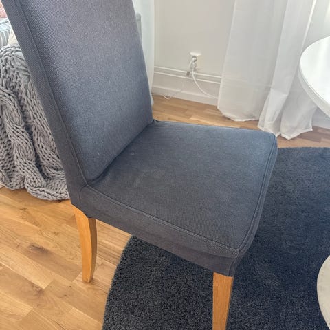 4 st Klädda matsalsstolar i grått tyg. Finns även 4 st klädslar i vitt som följer med.