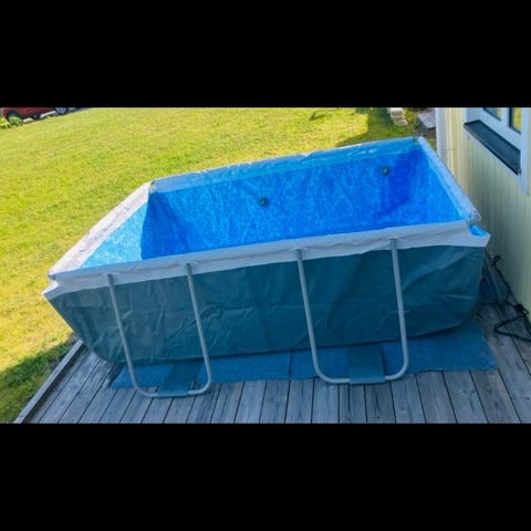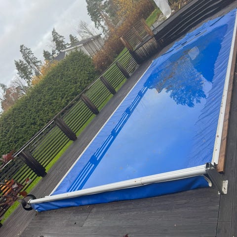 Pooltopp för 4×8 m med metallstativ. Duken fungerar men har några år på nacken. Konstruktionen består av en blå presenning/duk monterad på en längsgående rulle i metall, samt tillhörande metallprofiler och stativdelar. Passar för nedgrävd eller markpool beroende på mått och montering. Exakta mått och modell behöver kontrolleras på plats. Räcke att montera runt pool. Det är i två delar.
