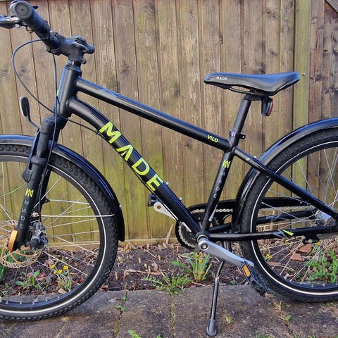 KTM Wildcat barncykel med 24" hjul. Cykeln har låg instegsram i gul/grön färg med röda detaljer. Utrustad med växlar bak, handbromsar fram och bak, skärmar, pakethållare och stöd. Lämplig som vardags- och skolcykel för barn som passar 24" hjulstorlek.