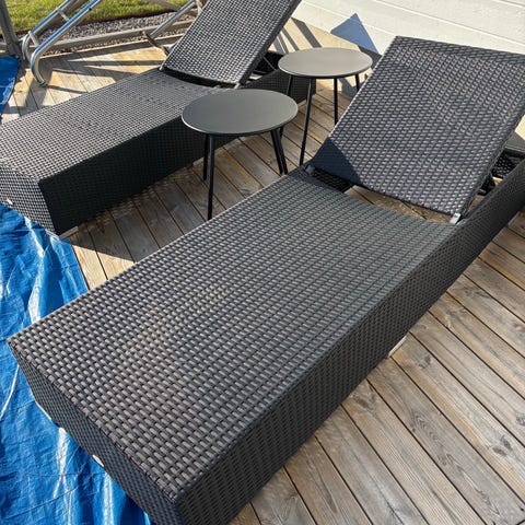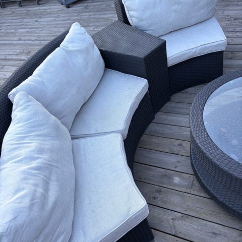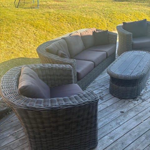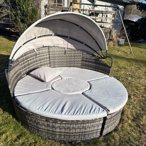 Solbädd i grå konstrotting. Oval form med flera separata sektioner upptill. Passar för utomhusbruk på altan, terrass eller trädgård. Rottingmaterialet är flätat och anpassat för utemiljö. Vissa skruvar har barnen tyvärr skruvat av, men är ju lätt fixat med nya skruvar, men därav låga priset. Dykornas resår behöver fixas, knutit dom nu. Dynorna behöver tvättas