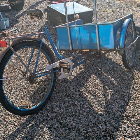 Hembygge, paketcykel med flak. Består av en 26 tum MTB från Cyclepro, en framgaffel från en BMX, svetsad stålram och ett flak med aluminiumplåt. Perfekt att åka och handla med. :-)