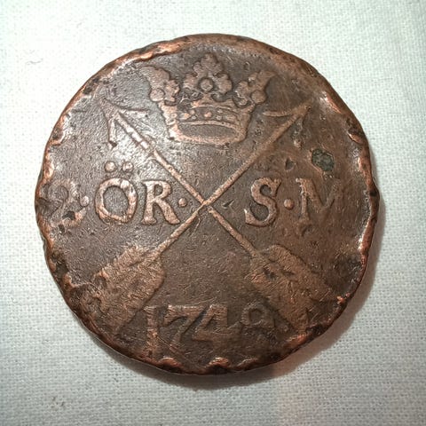 Svenskt 1 skilling mynt från år 1821 i koppar. Ena sidan visar valören 1 skilling med korslagda pilar och årtal 1821. Den andra sidan har kunglig monogramdesign med krona och stjärnor runtom. Myntet lämpar sig för samlare av äldre svenska mynt och numismatiskt intresserade.