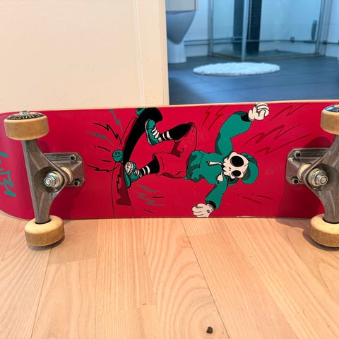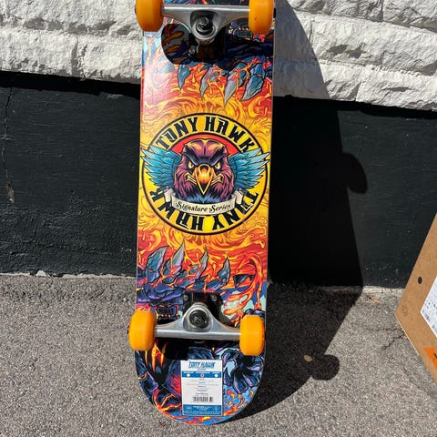 Tony Hawk skateboard komplett med färgstark grafik på undersidan och svart griptape på ovansidan. Brädan är utrustad med gula hjul och standardtruckar. Passar för åkning i park, på gata och för enklare trick. Storlek och material är inte angivna på bilderna.