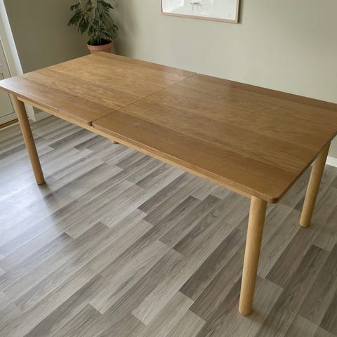 Matbordet heter Bjursta och är från IKEA. Det är 140 x 84 cm med höjd 75 cm. Två st 40 cm breda iläggsskivor medföljer.