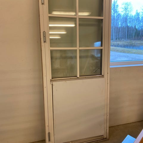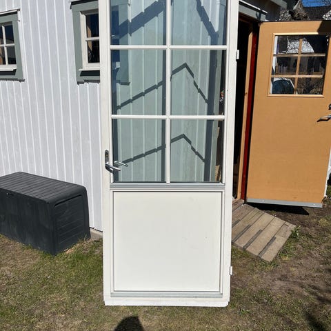 Målad innerdörr med större glasruta i övre delen. Dörren är försedd med handtag av sekelskiftes stil. Passar som innerdörr eller förrådsdörr där man vill ha ljusinsläpp genom glasrutan. Materialet är målat trä eller träfiberskiva med infällt glasparti.
