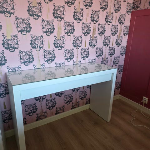 Ett superfint sminkbord från IKEA med två lådor och glasskiva. Måtten är: Bredd 120 cm, djup 40 cm, höjd 76 cm. Hämtas i Vendelsö.