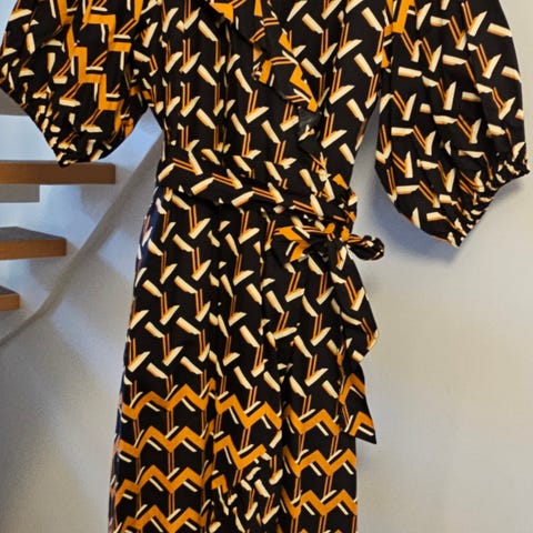 Vila vardagsklänning, omlott, storlek 36. Klänningen har ett grafiskt mönster i svartvitt och är knälång med korta, något vidare ärmar. Materialet är mjukt och följsamt viskos som passar för vardagsbruk. Lämplig som bekväm klänning till vardag och enklare tillfällen.